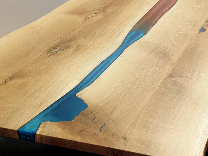 Unser Esstisch ”Feuer und Eis" wird in massiver Eiche massiv mit Baumkante hergestellt und in der Mitte mit Epoxidharz in den Farben Orangemetallic und Eisblau ausgegossen. Die Oberfläche ist geschliffen, poliert und geölt für eine perfekte Haptik.